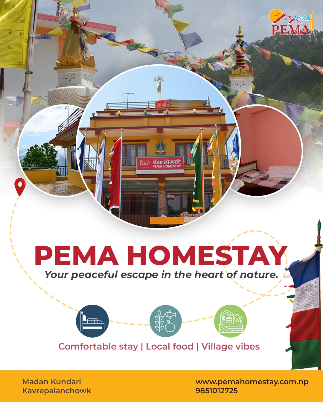 Complete visual identity for Pema Homestay, featuring a scenic, travel-oriented promotional layout emphasizing local experiences.