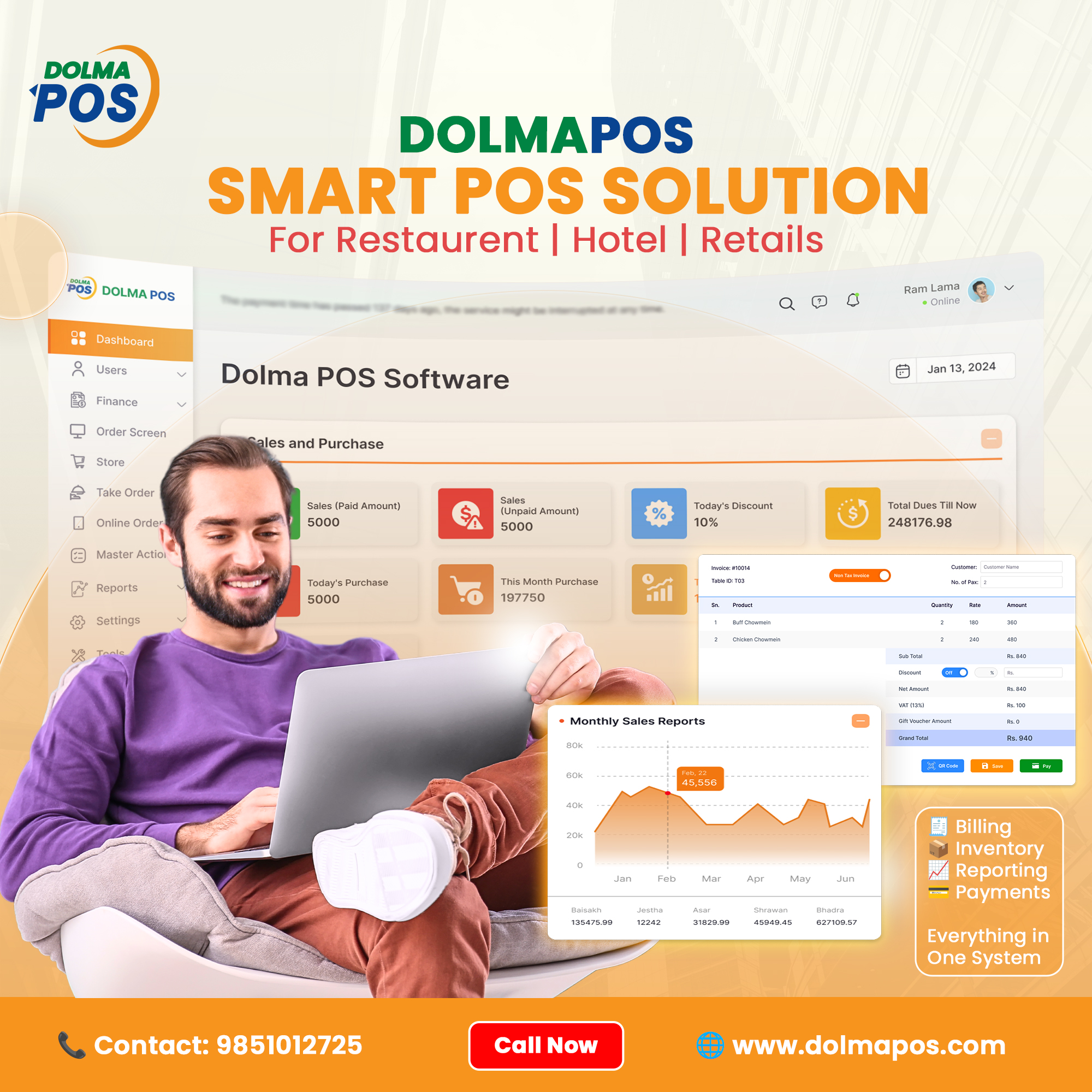 Comprehensive software interface presentation showcasing monthly sales reports and billing modules for retail and hotels.
